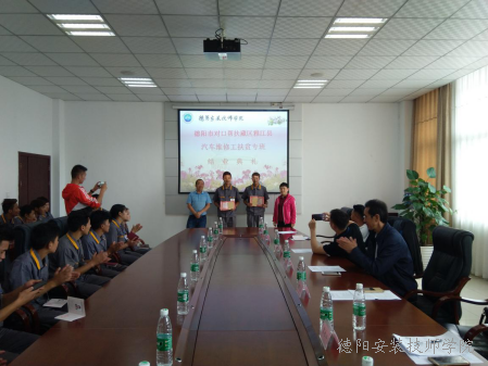 2018年9月16日下午,德阳市对口帮扶藏区雅江县汽车维修培训“扶贫专班”结业典礼在学院综合楼105会议室举行。雅江县人社局副局长雷永丰、田伟,德阳市人力资源和社会保障局职鉴科科长曾文力,德阳安装技师学院党委书记王选明出席典礼。