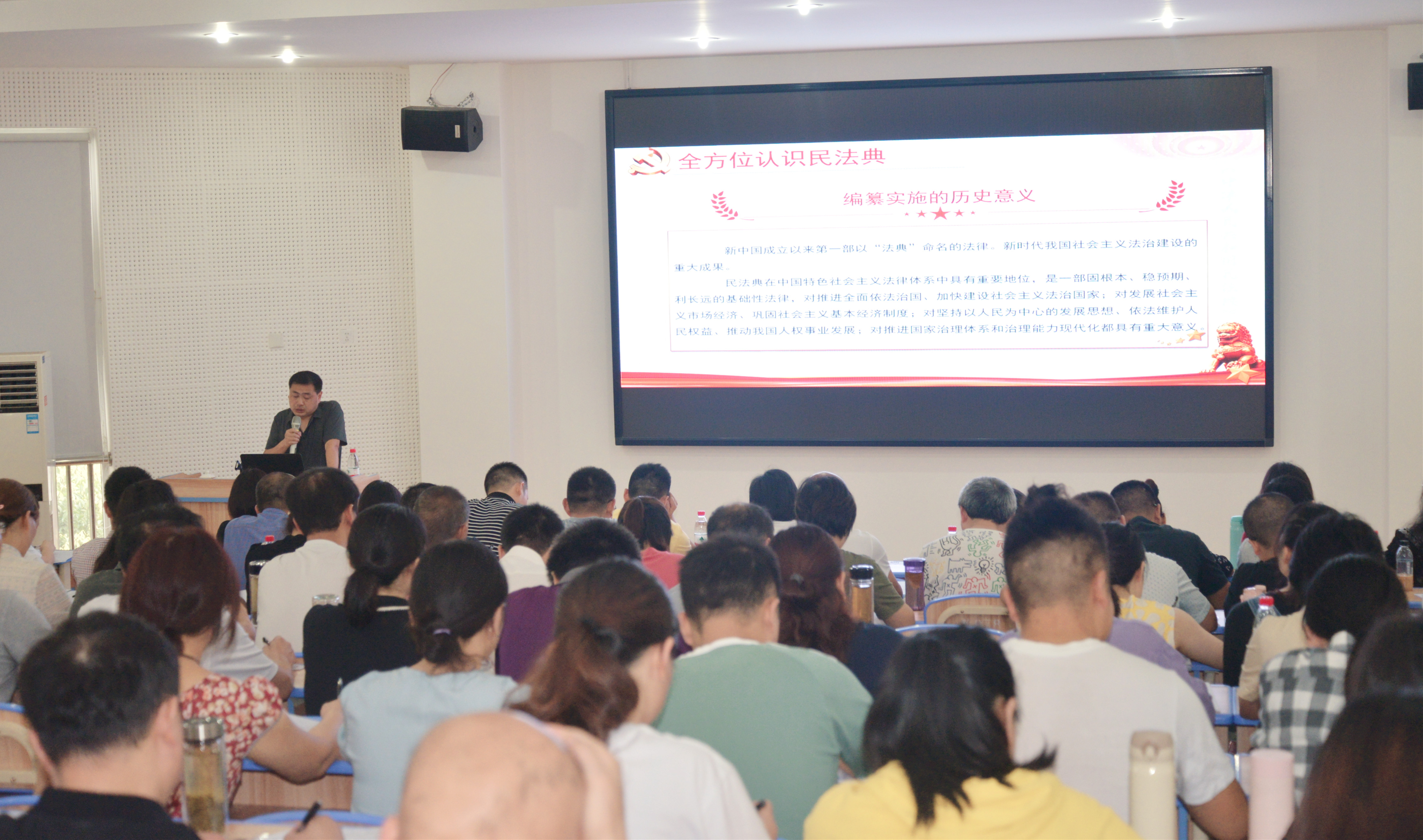 学院法律顾问、德阳市仲裁委员会仲裁员顾伦对民法典的作用、颁布意义以及20余个新规定、新概念进行了详细解读,并结合民法典对于自然人由出生至死亡的保护,用一个个生动而具体的案例,对见义勇为、高空抛物、离婚冷静期和遗嘱效力等具体法律规定进行了详细阐述,针对与学院业务相关的问题,如合同格式条款的效力、单位对于性骚扰的防范义务进行了重点讲述。通过以案普法的方式让在场的教职员工对法律有了新的认识。