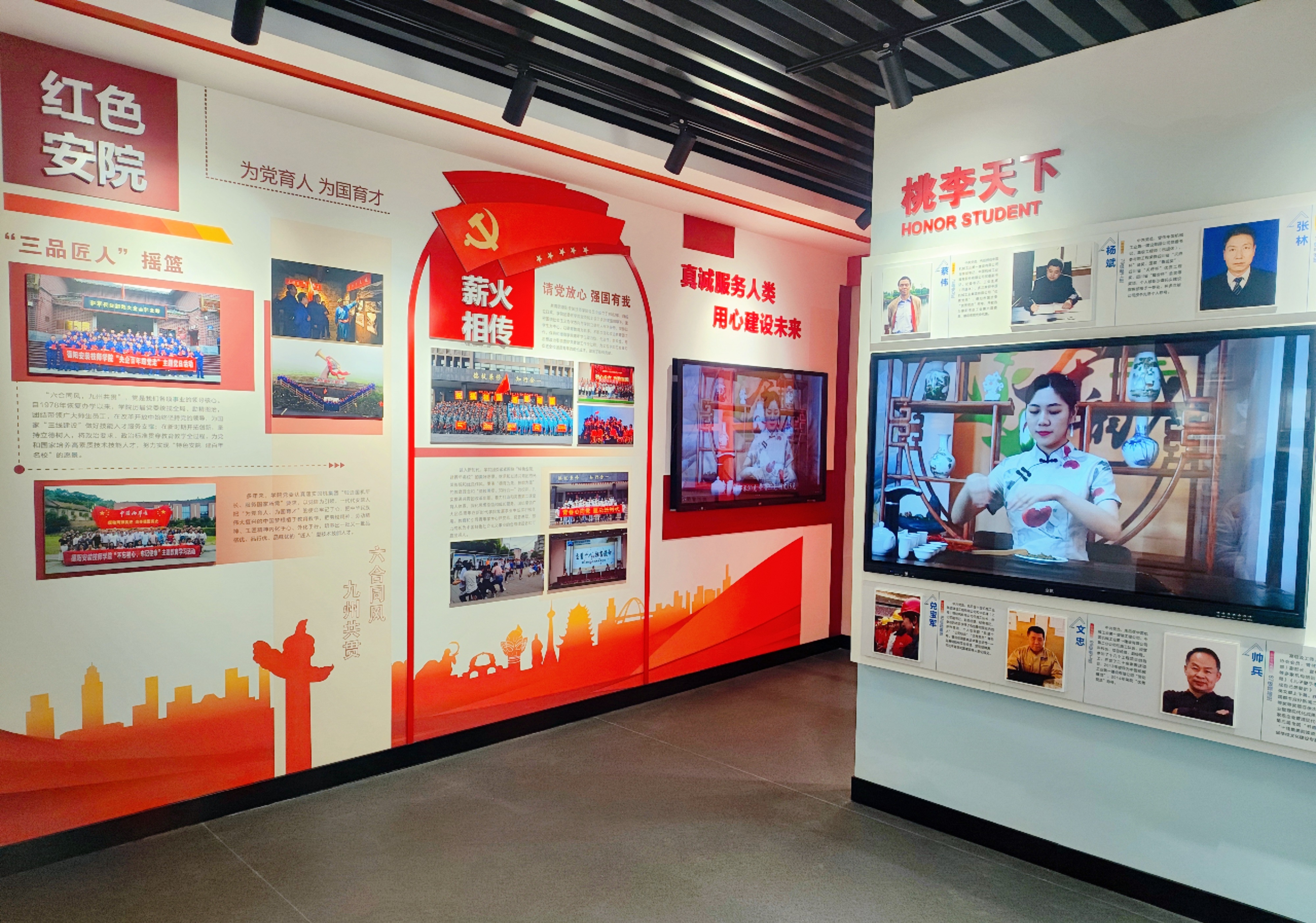 校史馆第一部分是国匠初心厅,展示的是从1956年洛阳技校创办至今77年的发展历程,一张张照片见证了安院成长的每一个足迹。第二部分是大匠运斤厅,分别从历任校长、特色专业、名师荟萃、专项建设、培训中心、央企担当、战略同盟、桃李天下、红色安院、多彩安院全方位立体再现了学校77年来的风雨历程和办学成就,凸显了历代安院人铭记“德技兼修,知行合一”的校训和“德育为先 技能为重”的教育理念,努力奋斗、开拓进取的精神风貌。第三部分是匠艺淬炼厅,一块块荣誉奖牌展示了学院77年取得的辉煌成就。