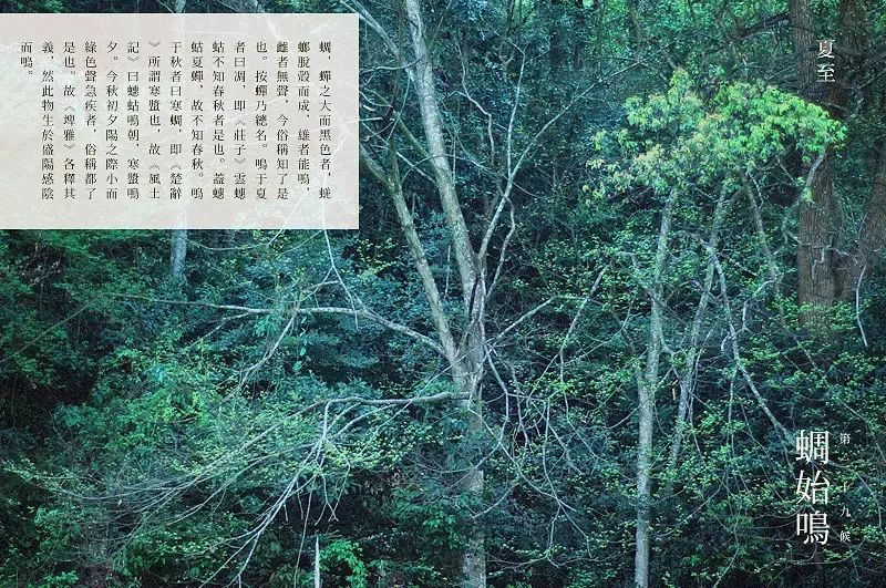 夏至为五月中。夏为大,至为极,万物到此壮大繁茂到极点、阳气也达到极致,所以是一年中夜最短、昼最长的一天,接近极地处是白夜,一年中最有诗意的一天。夏至日鹿角解,鹿是山兽属阳,感阴气才掉角。自此阴气在地底每天生长,阳气被逼而火躁,这就是溽蒸,随阴气逐渐上升而小暑、大暑。待阴气彻底钻出地面,天气凉爽,便是秋天了。阴阳之间,就是这样此消彼长,彼此作用。