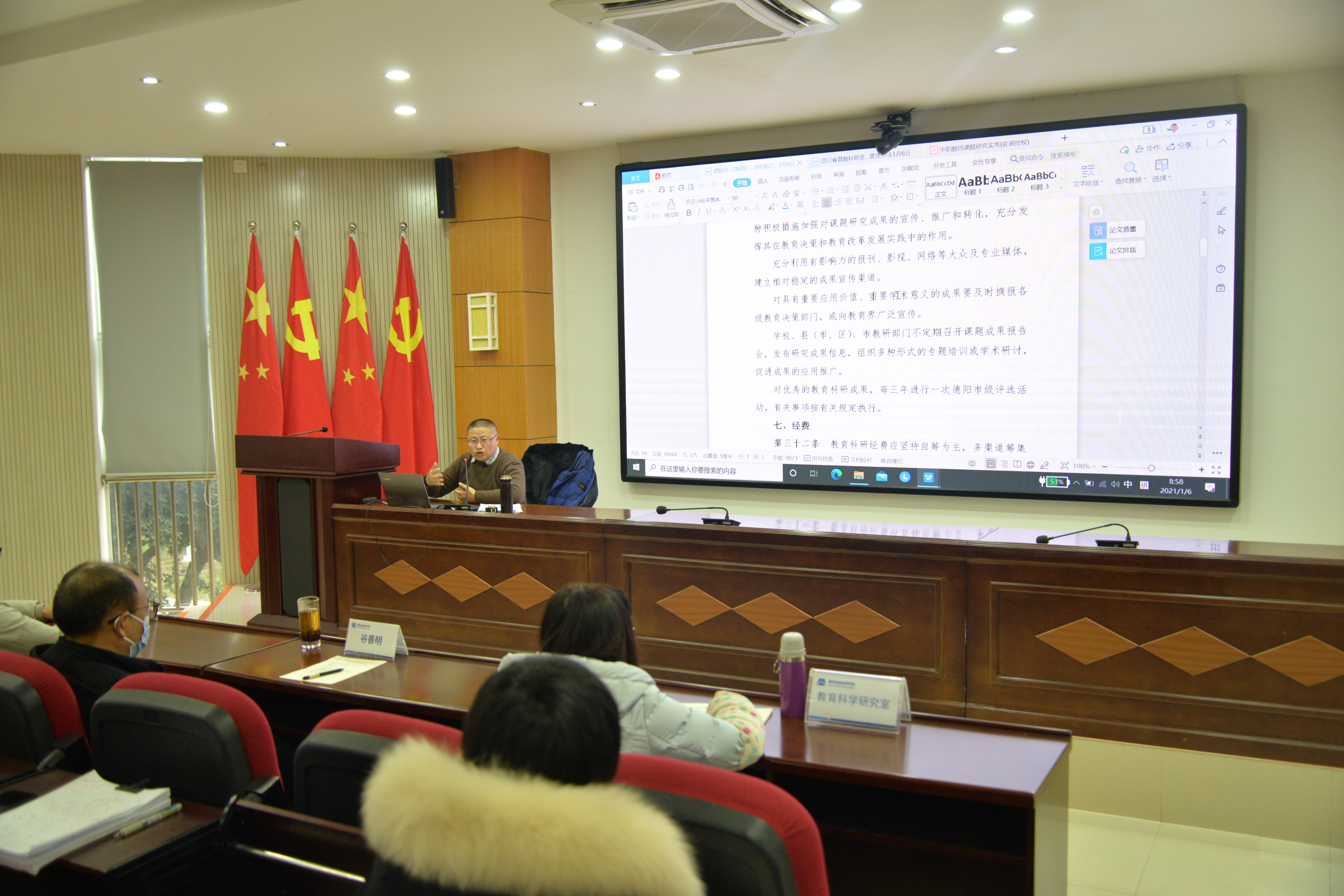 会上,蒋光明传达《德阳市教育局教育科研项目课题管理办法(2020年修订)》和《四川省普教科研资金课题管理办法(2014年修订)》两个文件精神,同时,运用案例和课题成果围绕课题研究逻辑、程序、环节等方面进行解析讲解。