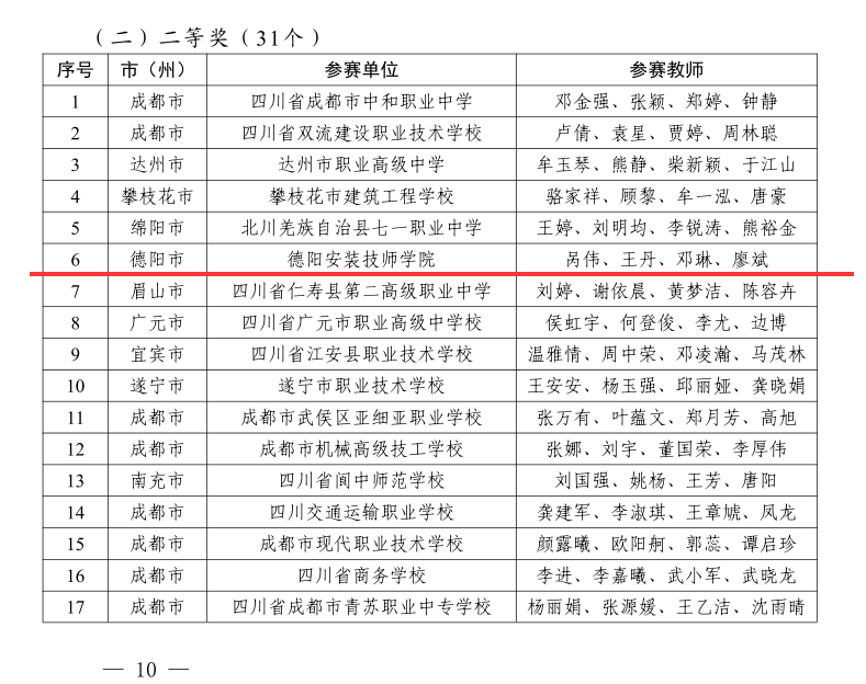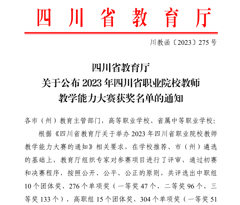 2023 年四川省职业院校教师教学能力大赛历经省市(州)初赛、决赛,学院呙伟(邓玲、王丹、廖斌)团队和高建(刘卫、刘勇、张正明)团队顶着暑热代表德阳市参加省级竞赛,经过团队成员的共同努力圆满完成比赛。呙伟团队荣获四川省二等奖的优异成绩。