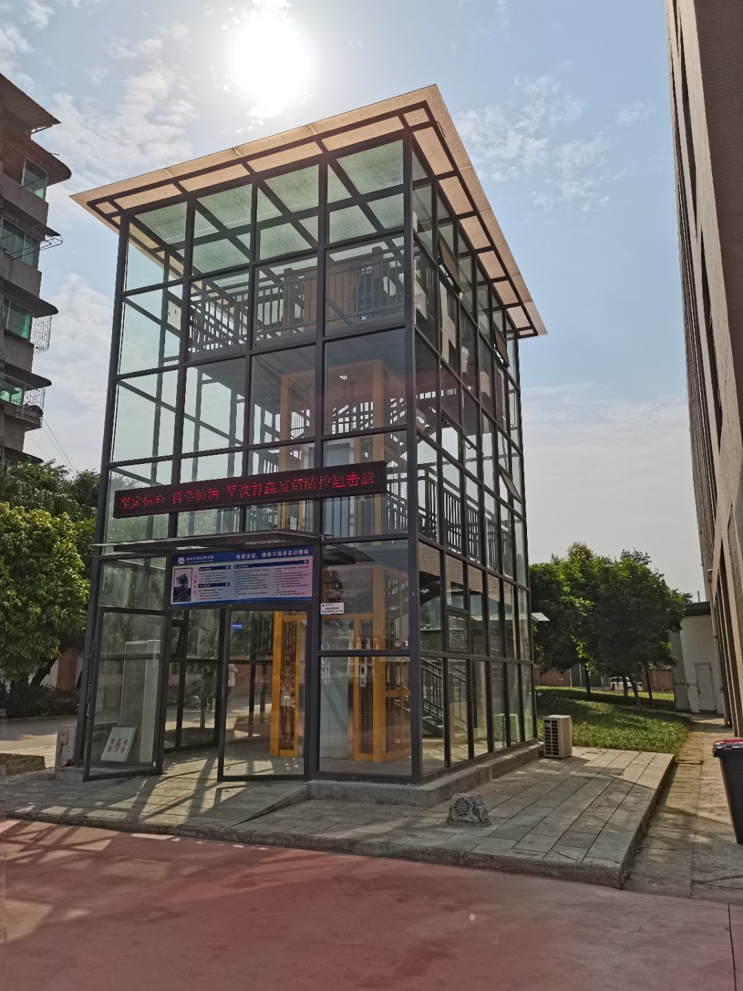 建有标准化的一体化实训室,户外电梯实训考核装置、户内群控电梯、自动扶梯,曳引机、门机、轿厢、安全钳-限速器等实训考核平台,工位数40,能满足工学一体化教学、项目式教学、案例式教学等。