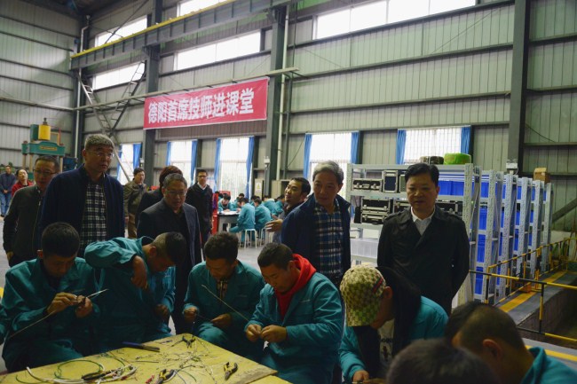 李敦双副主席一行实地考察了学院机电实训大楼与电气智造工程实训中心并观摩学生现场实习实训,了解了学院专业开设,校企多元合作人才培养,学生技能培养与成长,及就业发展等情况。参观过程,李敦双副主席对学院坚持特色发展以及在建设过程中取得的成绩给予了高度的肯定,并表示当前国家大力提倡培养工匠型高技能人才,德阳安装技师学院作为应用型高技能人才培养院校,在教学实践中将“工匠”与“智造”有效进行了教学融合与运用,希望学院坚持特色,坚持人才培养的魄力与动力,为地方经济,社会、国家培养更多优秀的技能人才。